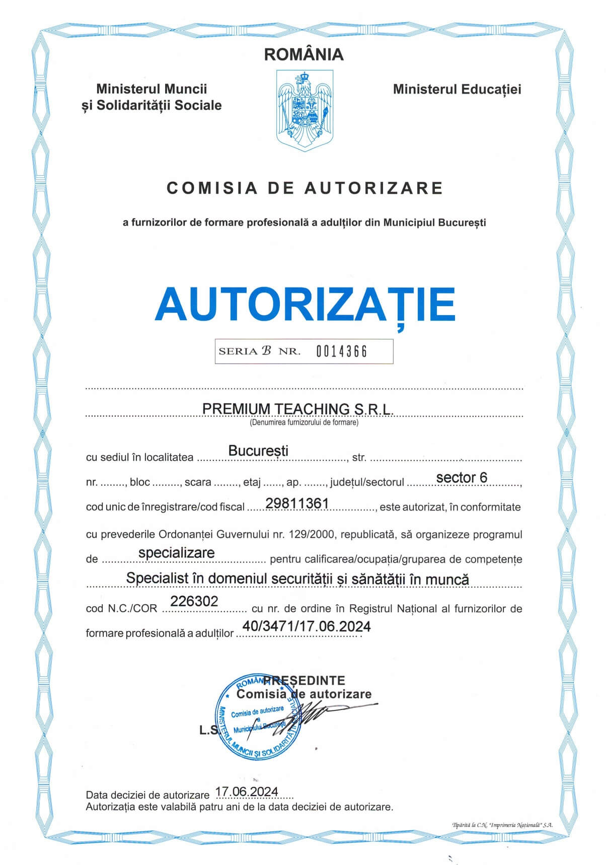 Cursurile organizate de Premium Teaching sunt autorizate de Ministerul Muncii și Ministerul Educației. Diplomele eliberate de Premium Teaching sunt recunoscute la nivel național și au valabilitate nelimitată.